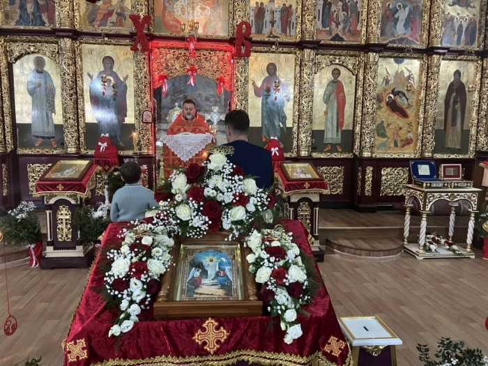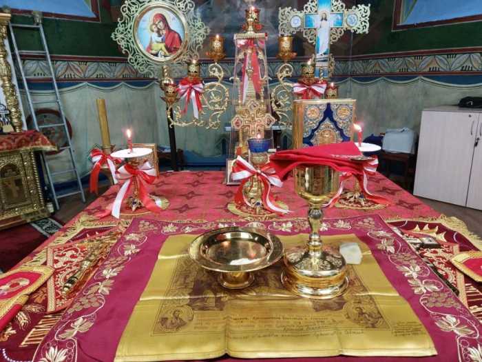 По окончании чтения канона отцом Олегом Плащаница Господа была занесена в алтарь и положена на престоле.