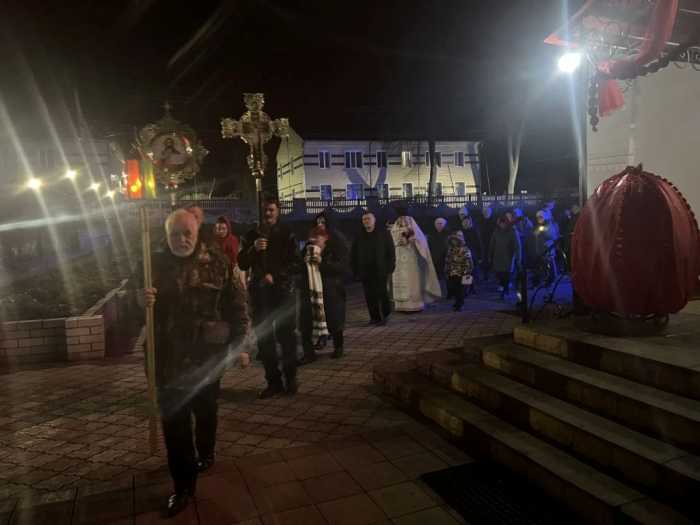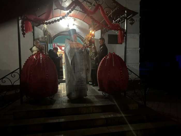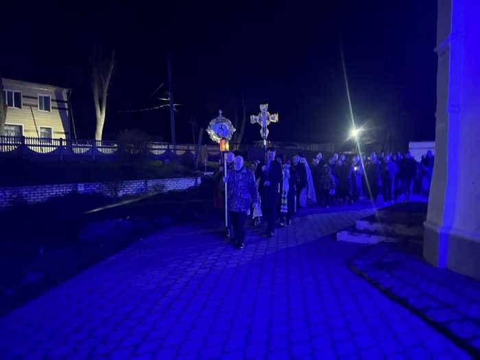 Под пение стихиры «Воскресение Твое, Христе Спасе…» в третий раз, открылись Царские врата, и все прихожане храма вышли на крестный ход. Обойдя храм, хоругвеносцы, настоятель храма, клирос и православные остановились на крыльце перед закрытыми дверьми храма, которые символизируют в тот момент закрытый гроб Христа Спасителя.